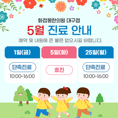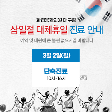 | ▶ 토요일은 점심시간 없이 진료합니다. ▶ 변동 일정, 공휴일 진료 일정은 SNS/카톡채널/홈페이지 공지를 참고 부탁드립니다. |